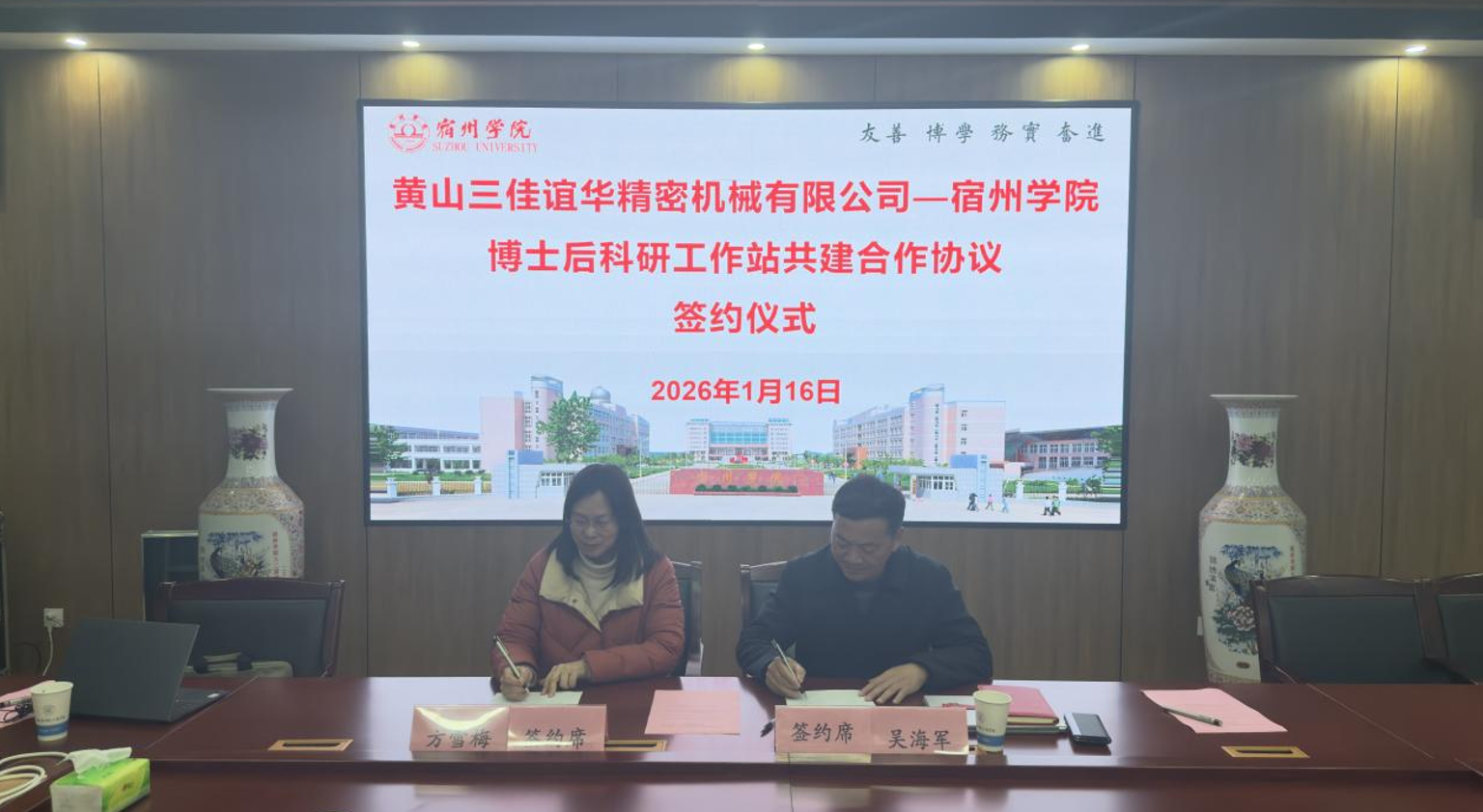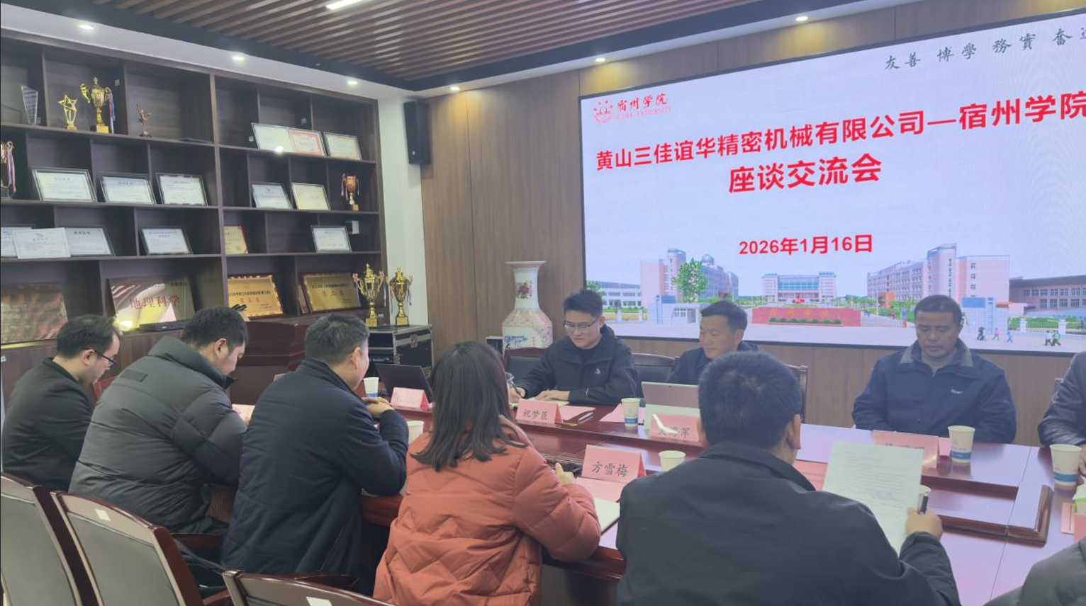 1月16日下午,黄山三佳谊华精密机械有限公司总经理吴海军带队前往宿州学院,参观了安徽省煤矿勘探工程技术研究中心,并与该校环境与测绘工程学院、资源与土木工程学院开展座谈交流。双方围绕技术攻关、人才培养、平台共建等方向展开深入探讨,并成功签订博士后科研工作站共建合作协议,标志着校企合作迈入实质性推进阶段。