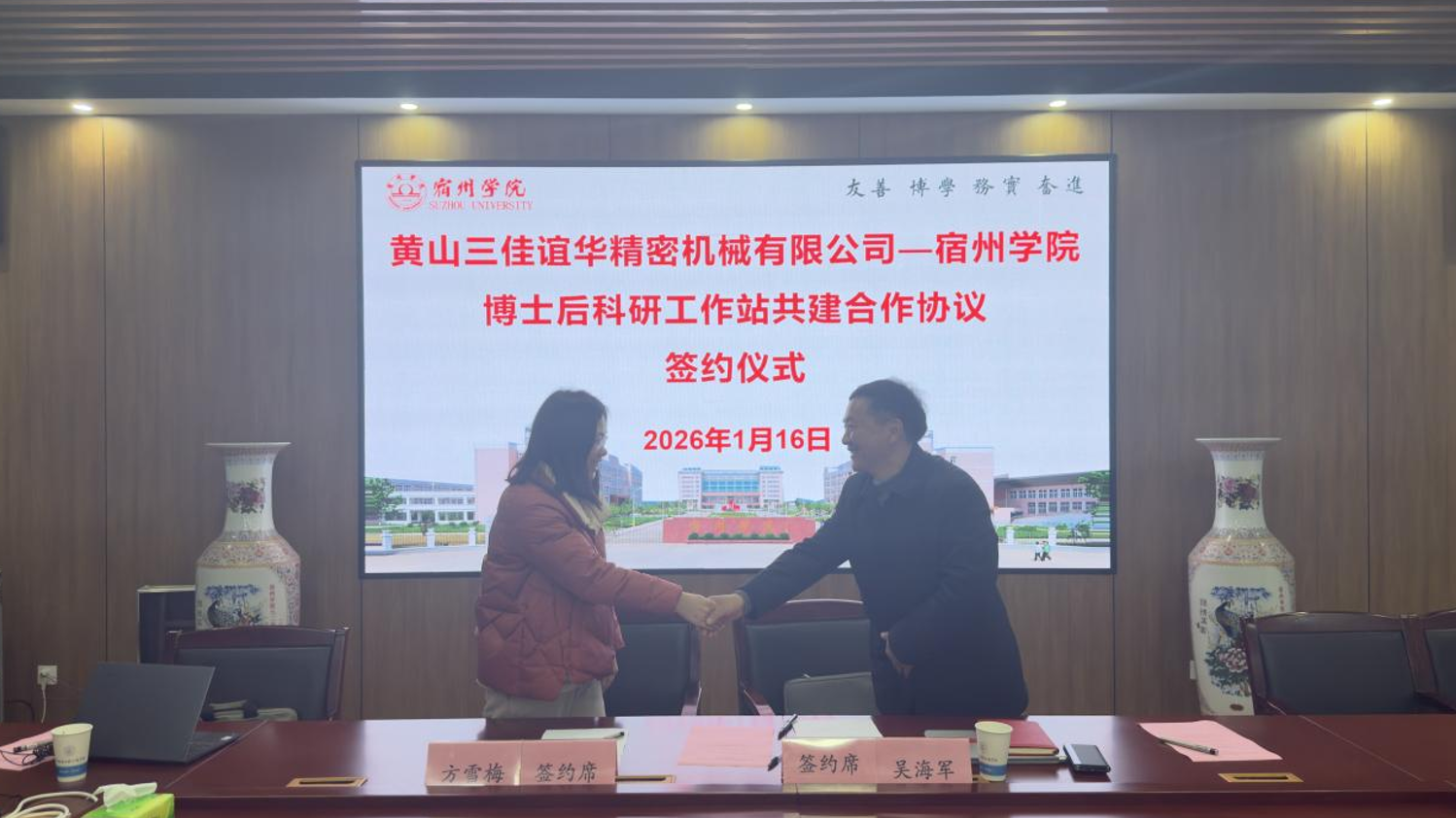 1月16日下午,黄山三佳谊华精密机械有限公司总经理吴海军带队前往宿州学院,参观了安徽省煤矿勘探工程技术研究中心,并与该校环境与测绘工程学院、资源与土木工程学院开展座谈交流。双方围绕技术攻关、人才培养、平台共建等方向展开深入探讨,并成功签订博士后科研工作站共建合作协议,标志着校企合作迈入实质性推进阶段。